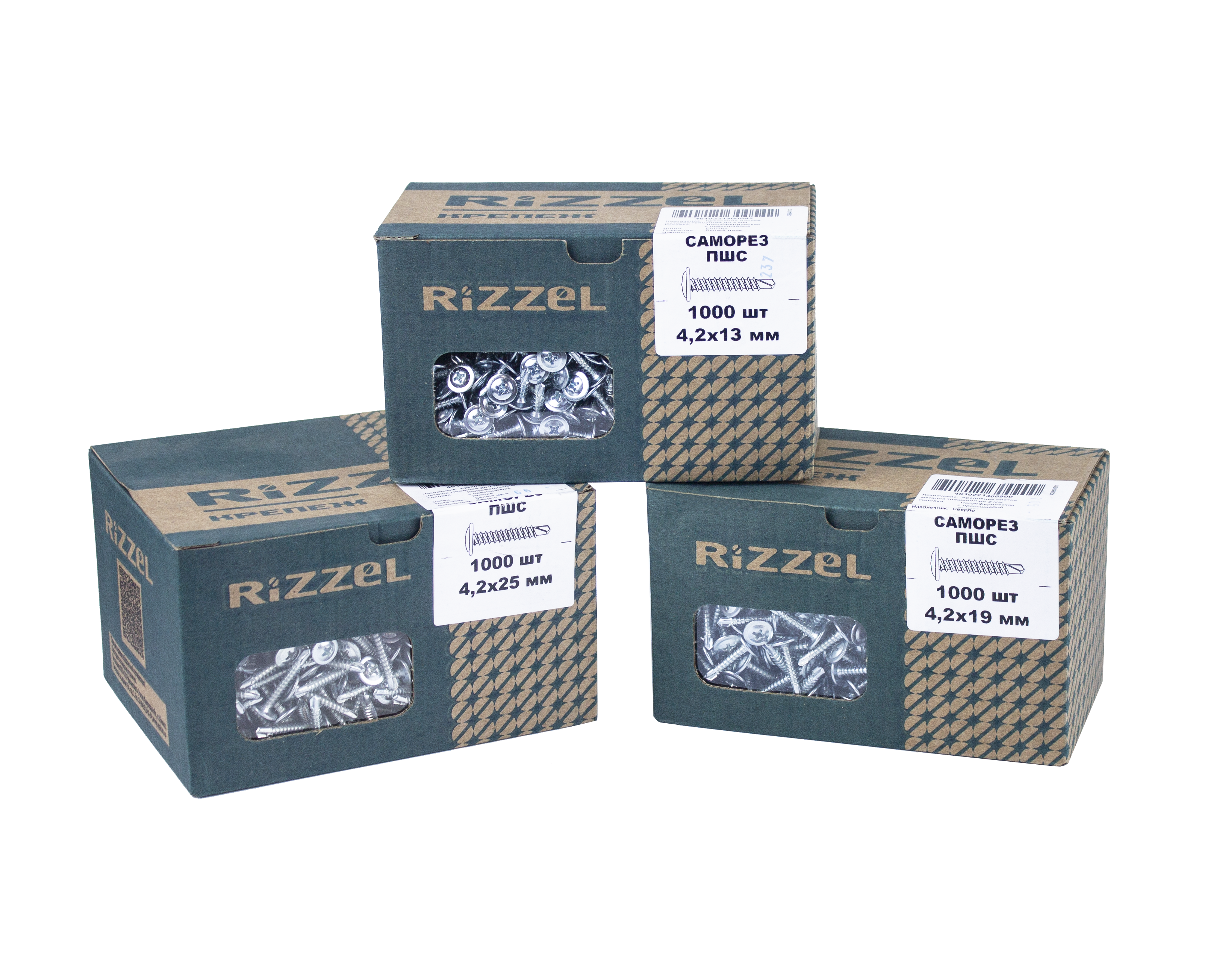 Саморез ПШС Rizzel - с напрессованой шайбой имеют широкую плоскую головку под крестовидную биту (PH2), которая одновременно выполняет роль шайбы. Наконечник оцинкованный - сверло.